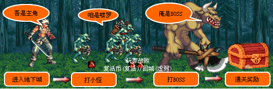 一般情况下,玩家通关地下城的过程可以用以下模拟图表现:
